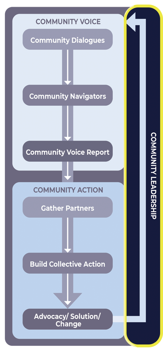 Community leaders help us identify shared interests, issues impacting equity, and where there’s desire and potential for action and change. Using action items stemming from the Community Voice Report, we support the vision and strategy, making sure agency stays in the community’s hands.